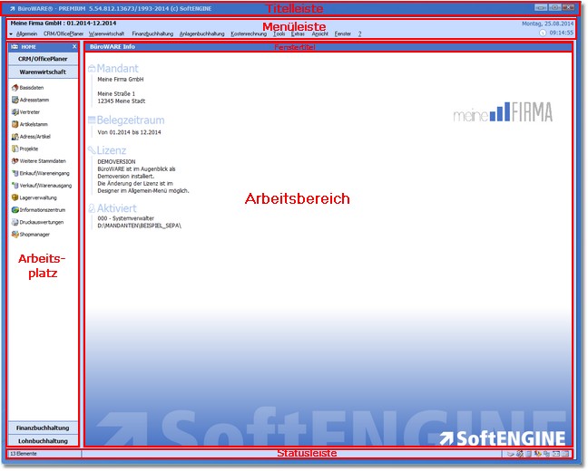 Der Arbeitsbereich zeigt im Hauptbildschirm (Abb.) Informationen über Mandant, Belegzeitraum, Lizenz, aktivem Benutzer sowie das Firmenlogo an. Jeder dieser Bereiche ist per Mausklick aktivierbar, der Cursor verwandelt sich über einem auswählbaren Bereich in eine Hand.