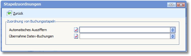 Über den Menüeintrag "Bearbeiten > Stapelzuordnungen" in den Basisdaten werden Buchungsstapel für verschiedene Buchungsvorgänge zugewiesen:
