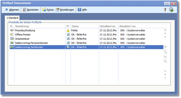 Der Prüflauf bietet die Möglichkeit, die Buchhaltungsdaten „maschinell" zu überprüfen. Unter maschinellen Kontrollen sind dabei alle Prüfbedingungen zu verstehen, welche die Verarbeitung von nicht plausiblen und unvollständigen Daten verhindern sollen. Der Buchhaltungsprüflauf übernimmt dabei zusammengefasst folgende Aufgaben: