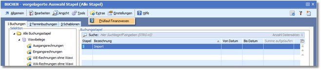 2.Klicken Sie mit der Maus auf den Menüpunkt "Extras > Prüflauf Finanzwesen".