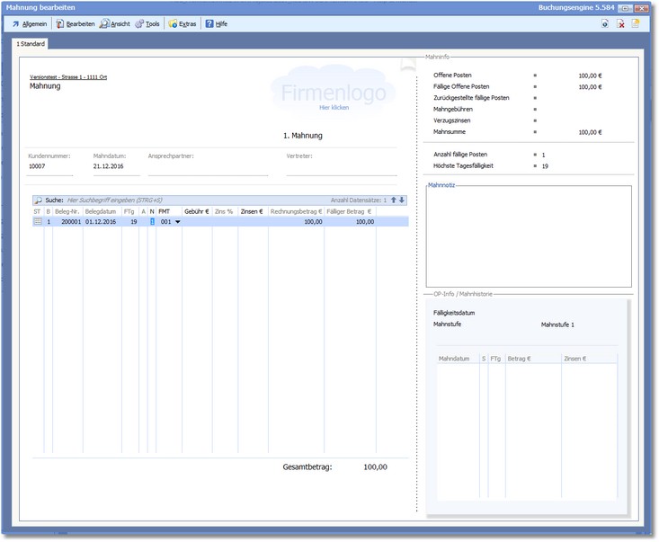 << Hier KLicken um eine Inhaltsübersicht anzuzeigen >> Navigation: Finanzbuchhaltung > Mahnwesen > Einzelne Mahnung bearbeiten |