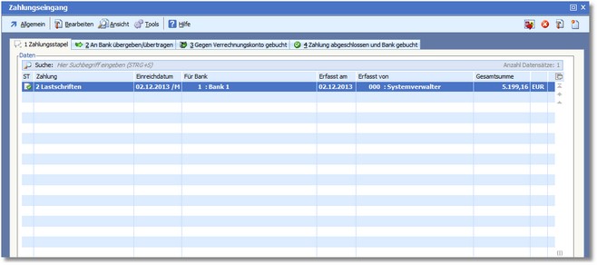 Mit [F9] werden die Zahlungsstapel anschließend an die Bank übertragen und in die Karteikarte "2 An Bank übergeben/übertragen" verschoben.