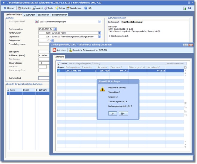 Beim Speichern der Buchung wird das Dialogfenster "Zahlungsverkehr/ELKO - Disponierte Zahlung zuordnen" aufgerufen.