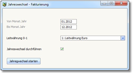 Im Dialog "Jahreswechsel - Fakturierung" sind folgende Eingabeoptionen verfügbar: