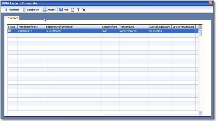 5. Wenn ein Kunde noch kein hinterlegtes SEPA-Mandat hat, dann können Sie dies mit [F3] bzw. über den Menüeintrag "Bearbeiten > Neues Mandat" in der Übersicht der Mandate neu anlegen.