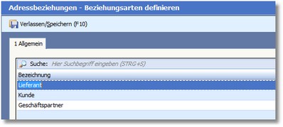 In dieses Feld können Sie eine Beziehungsart, z.B. "Lieferant", eingetragen. Wählen Sie mit [F5] aus der Auswahl Beziehungsart die gewünschte Beziehung aus und übernehmen Sie diese mit [RETURN] in das Feld.
