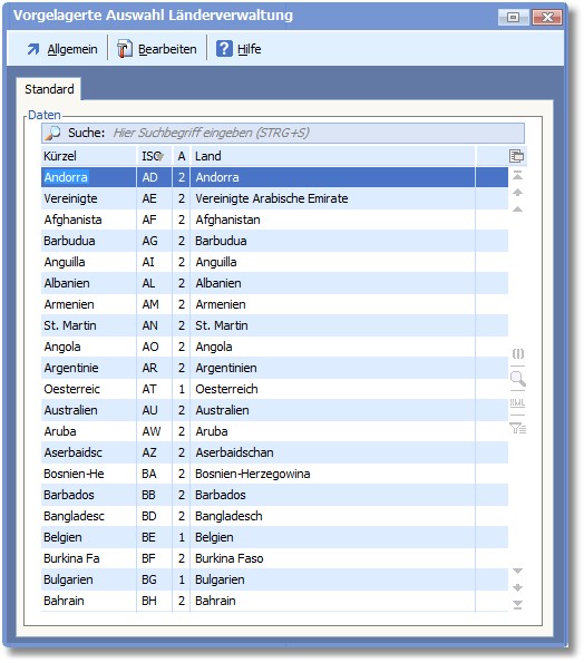 Mit der Länderverwaltung stellt das Programm einen Stammbereich für die Ländertabelle nach dem ISO-ALPHA-II-Code zur Verfügung. Außerdem wird die Speicherung von landesspezifischen Parametern ermöglicht, die bei der Zuordnung eines Landes zu einer Adresse in den Kunden- oder Lieferantenstammsatz übernommen werden können. Im Lieferumfang der ERP-Warenwirtschaft befinden sich ca. 200 Länderdaten.