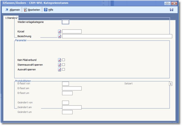 << Hier KLicken um eine Inhaltsübersicht anzuzeigen >> Navigation: OfficePlaner > Wiedervorlage > Wiedervorlage - Menüleiste > CRM/Vertriebssteuerung > WVL-Kategorienstamm > WVL-Kategorien bearbeiten > Der Dialog "Erfassen/Ändern - CRM-WVL-Kategorienstamm" |
