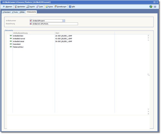 Hier werden alle dem Artikel zugewiesenen Dokumente (z.B. Bilder) in einer Tabelle angezeigt.