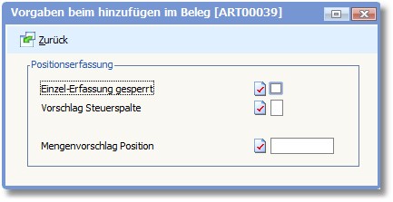 Hier können Sie für diesen Artikel das Mengenfeld in der Positionserfassung mit einem Wert vorbelegen.