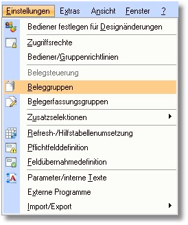 2. Klicken Sie mit der Maus im Hauptmenü auf "Einstellungen" und dann auf "Beleggruppen".