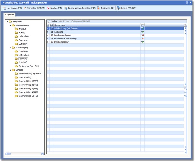 Das Programm öffnet die vorgelagerte Auswahl der Beleggruppen.