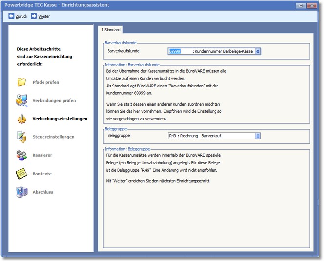 Sie können die vorgeschlagenen Einstellungen übernehmen oder mit [F5] andere Werte für BARVERKAUFSKUNDE oder BELEGGRUPPE jeweils aus einer Tabelle auswählen.