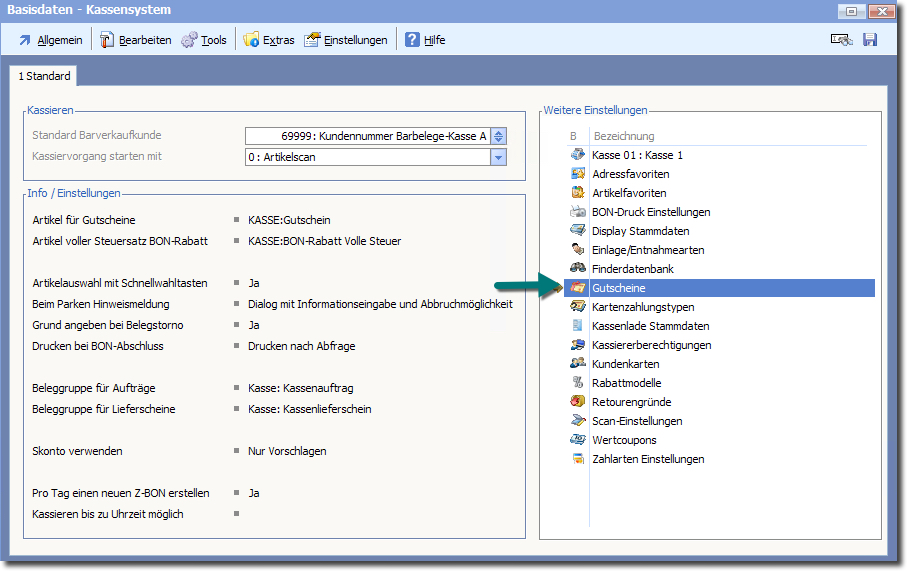 Öffnen Sie die Gutscheindatenbank finden Sie in den "Basisdaten Kasse" ➜ "Weitere Einstellungen" ➜ "Gutscheine".