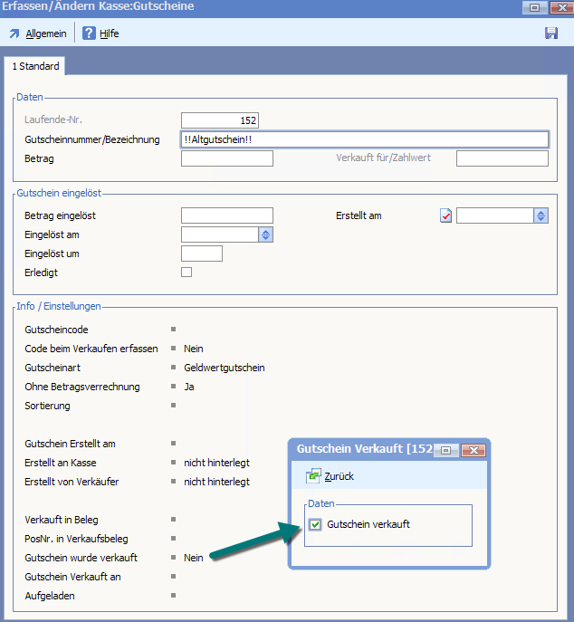 Zusätzlich muss das Kennzeichen "Gutschein verkauft" gesetzt werden. klicken Sie auf den Text "Gutschein wurde verkauft", um die Optionsmaske anzuzeigen.