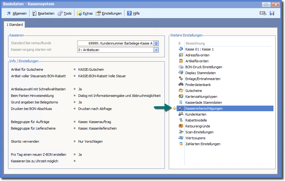 Öffnen Sie dazu die Basisdaten der Kasse und wählen Sie dort "Kassiererberechtigungen".