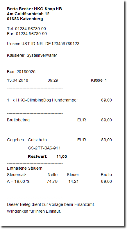 Der Zahlvorgang wird beendet und der Gutschein über den Restbetrag ausgedruckt.