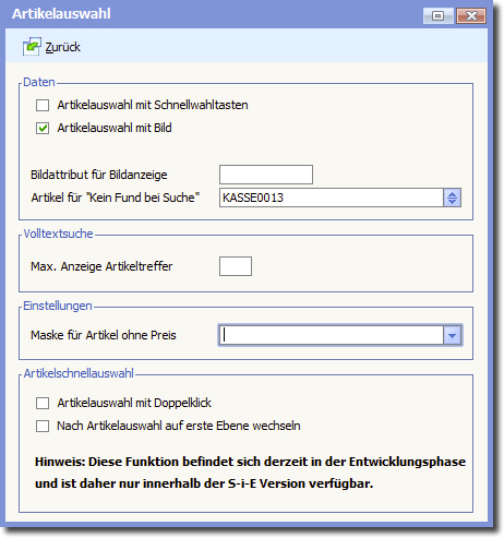 Hier steuern Sie das Verhalten innerhalb der Artikelschnellauswahl, wenn diese aktiv ist.