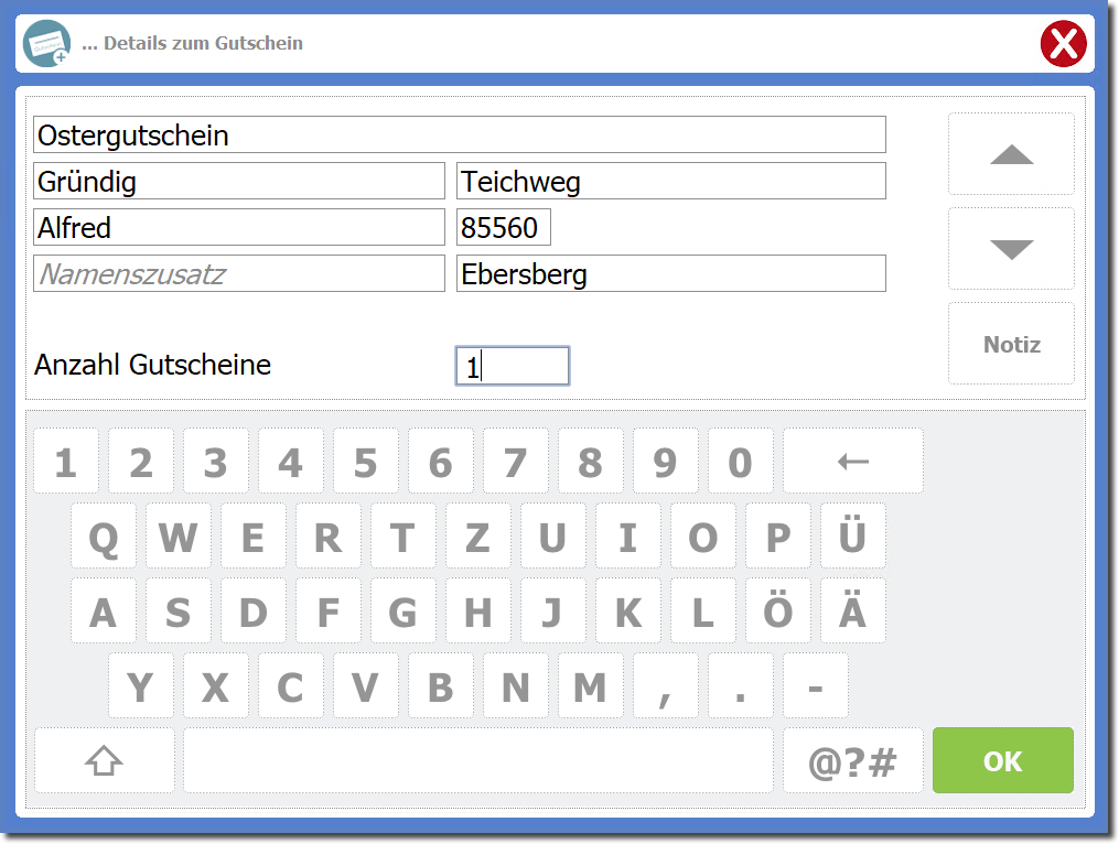 Sie können direkt beim Verkauf einen Empfänger (Name und Adresse) und auch einen Gutscheintitel angeben.