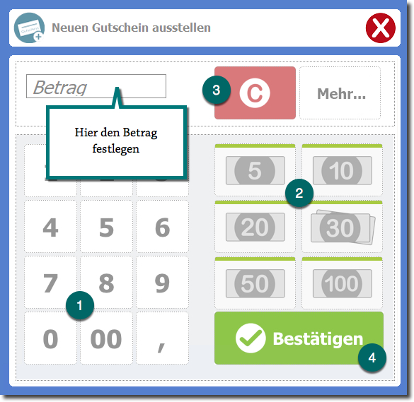 Nutzen Sie die Tastatur, den Nummernblock des Touchscreens (1) oder die "Geldscheinschnellwahltasten" (2), um den Gutscheinbetrag festzulegen.