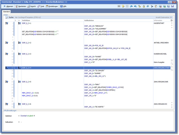 Über die "Eventart, DISP_0_3", kann im Eventscript geprüft werden, welche Aktion gerade an der Kasse ausgeführt werden. Hier gibt es folgende Aktionen:
