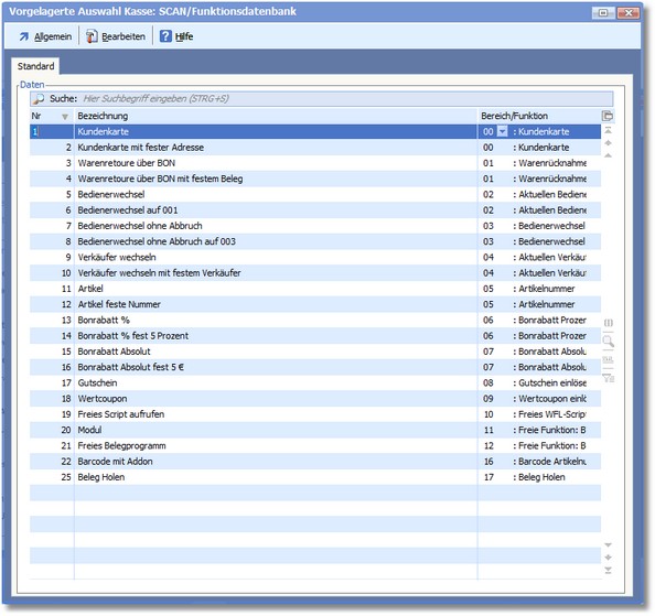 Mit den SCAN-Einstellungen ist es möglich, Kassenfunktionen anhand eines SCANs im Artikelnummernfeld auszulösen oder auch bspw. den Preis, Menge oder Gewicht eines Artikels aus dem SCAN-Wert auszulesen.