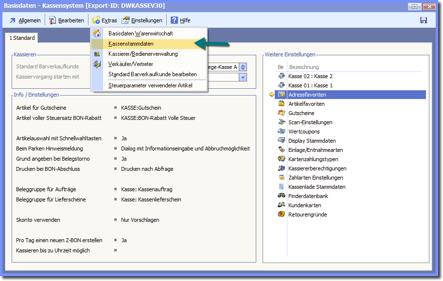 Sie können auch über das Menü "Extras ➔ Kassenstammdaten" zu einer Übersicht der Kassen gelangen und dort die gewünschte Kasse auswählen.