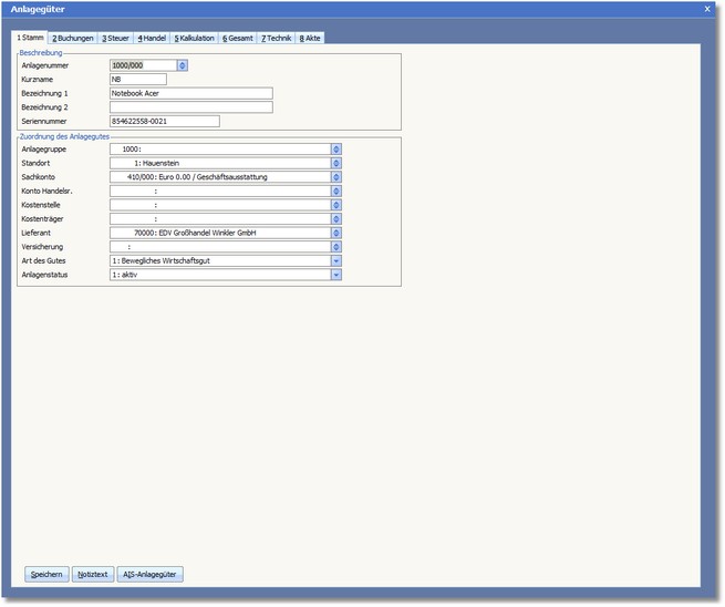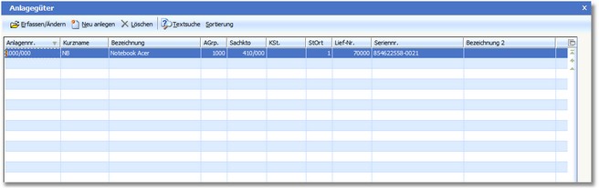 2. Geben Sie nun die notwendigen Daten in die Felder ein und speichern Sie das neue Anlagegut mit [F10].