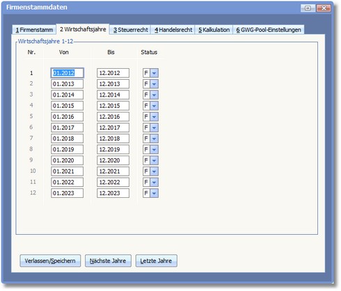 Für das 1. Jahr wird der Beginn des Wirtschaftsjahres eingetragen. Der Beginn nachfolgender Wirtschaftsjahre wird vom Programm ermittelt und eingesetzt. Eine Änderung des Beginns nachfolgender Jahre ist nicht möglich. Die Eingabeform ist Monat/Jahr [MM.JJJJ].
