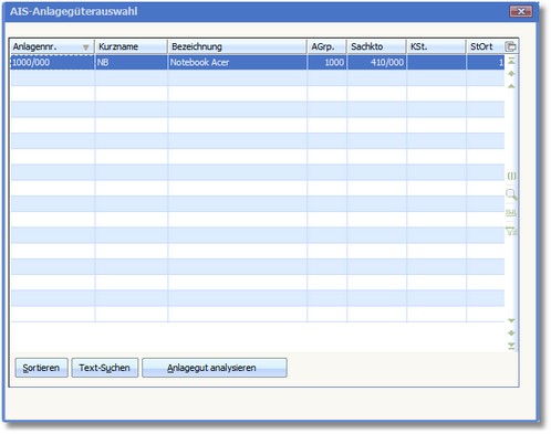 Zunächst öffnet sich eine vorgelagerte Auswahltabelle, in der alle Anlagegüter aufgelistet sind.