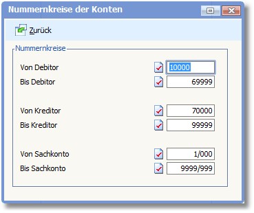 Über den Menüpunkt "Bearbeiten > Nummernkreise der Konten" in den Basisdaten werden die Nummernkreise für Kunden und Lieferanten festgelegt. Die Felder sind bereits mit den Werten aus dem Einrichtungsassistenten belegt. Diese sind identisch zu den Nummernkreisen aus der Warenwirtschaft.