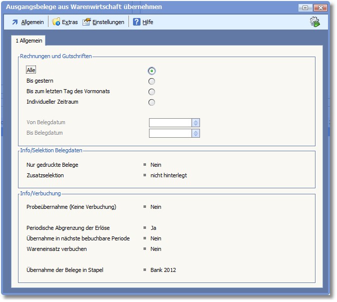 7. Nehmen Sie die gewünschten Einstellungen vor und starten Sie die Belegübernahme mit [F9] bzw. Klick auf den Quicktoolbutton rechts in der Menüleiste.