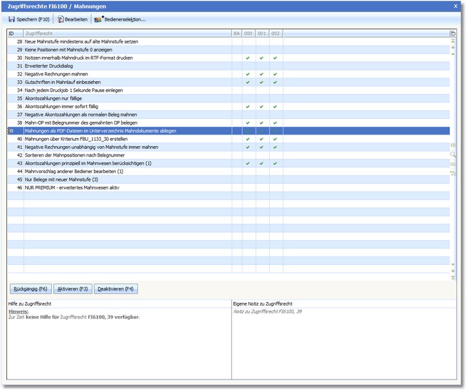 Damit PDF-Dateien gespeichert werden können, muss das Zugriffsrecht 39 "Mahnungen als PDF-Dateien im Unterverzeichnis Mahndokumente ablegen" im Bereich Finanzbuchhaltung -> Mahnungen (FI1600) aktiviert sein (Defaulteinstellung=aktiv).