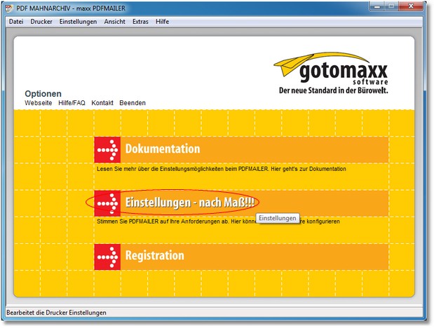 Nach Anlage des neuen Druckers „PDFMAHNARCHIV“ rufen Sie diesen über die Windows-Startleiste auf und starten die „Einstellungen – nach Maß!!!“