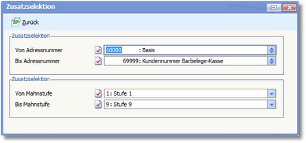 << Hier KLicken um eine Inhaltsübersicht anzuzeigen >> Navigation: Finanzbuchhaltung > Mahnwesen > Probedruck der Mahnungen > Zusatzselektion |