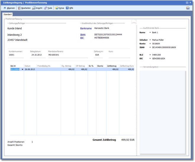 << Hier KLicken um eine Inhaltsübersicht anzuzeigen >> Navigation: Finanzbuchhaltung > Zahlungsverkehr > Zahlungseingang > Manuelle Zahlungseinzüge > Positionserfassung Zahlungseingang |