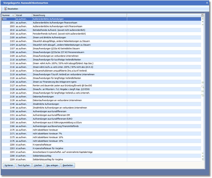 Das Programm öffnet die vorgelagerte Auswahltabelle der Kostenarten.