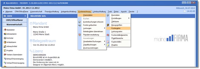 1. Klicken Sie mit der Maus im Hauptmenü auf "Kostenrechnung / Stammdaten / Kostenarten".