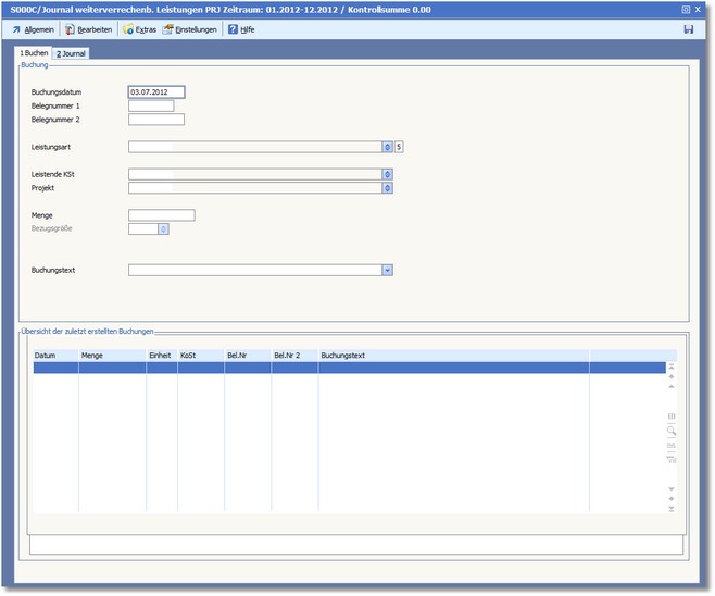 Das Programm öffnet die Buchungsmaske für die Erfassung von weiterverrechenbaren Leistungen an Projekte.