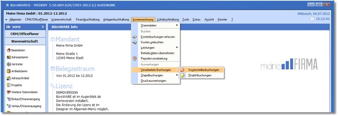 1. Klicken Sie mit der Maus im Hauptmenü auf "Kostenrechnung > Auswertungen > Projektbuchungen".