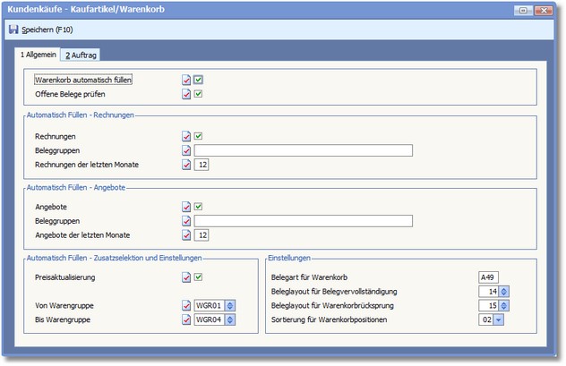 In diesem Dialog können Einstellungen hinterlegt werden, wie der Warenkorb eines Kunden bei Aufruf automatisch gefüllt werden soll.