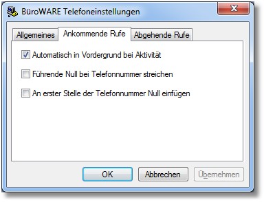 << Hier KLicken um eine Inhaltsübersicht anzuzeigen >> Navigation: OfficePlaner > Telekommunikation/BüroWARE Phone > Einstellungen für ankommende Anrufe |