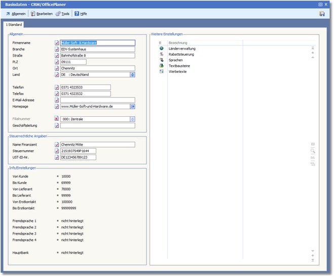 Die Basisdaten - CRM/OfficePlaner werden geöffnet.