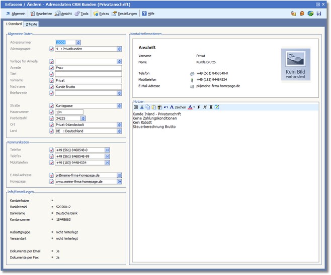 In diesem Dialog werden alle Daten zur Adresse verwaltet (Name, Anschrift, Kommunikationsdaten etc.), welche für das CRM von Bedeutung sind. Ebenso ist aber auch ein schneller Wechsel in die Adressbearbeitung der Warenwirtschaft und der Finanzbuchhaltung möglich, um Daten aus diesen speziellen Bereichen zu bearbeiten.