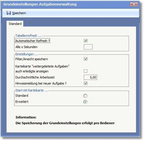Legen Sie hier durch die Wahl der entsprechenden Option fest, ob die Aufgabenverwaltung beim nächsten Aufruf mit der Karteikarte "Standard" oder "Erweitert" geöffnet werden soll.