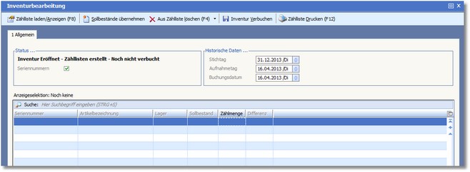 Das Programm öffnet die Inventurbuchungsliste.