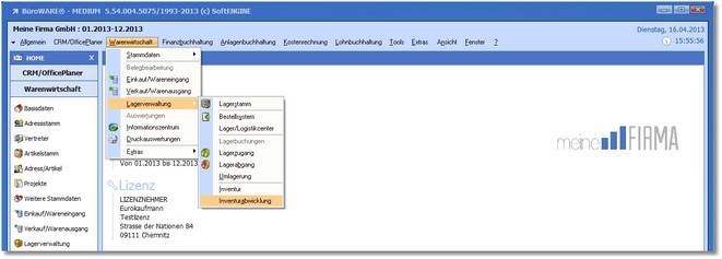 1. Klicken Sie mit der Maus im Hauptmenü auf "Warenwirtschaft > Lagerverwaltung > Inventurabwicklung".