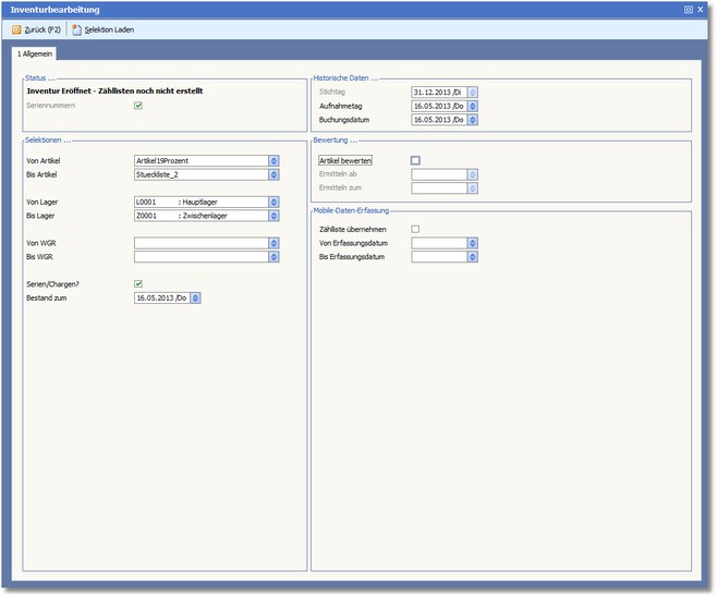 4. Bei nochmaligem Aufruf der Inventurabwicklung wird nun die Inventurbearbeitung geöffnet.