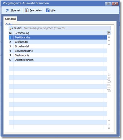 Das Programm öffnet die vorgelagerte Auswahltabelle der Branchen.