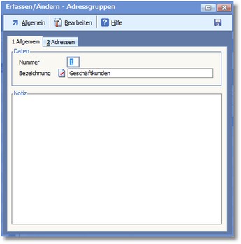 << Hier KLicken um eine Inhaltsübersicht anzuzeigen >> Navigation: OfficePlaner > Stammdaten > Adressstamm > Adressgruppen > Die Karteikarte "Allgemein" |
